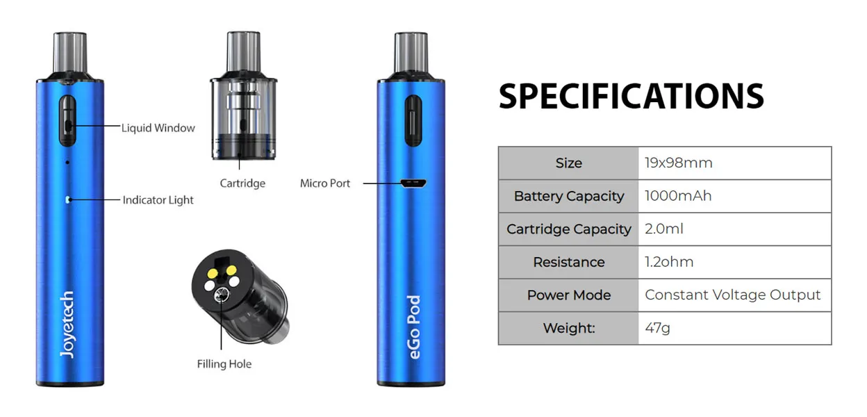 The Joyetech eGo Pod Kit 1000mAh for you! The design philosophy of Joyetech eGo Pod Kit is Easy is Perfect! The Joyetech eGo Pod Kit adopts integrated circuit for stable current output and long lifespan. And the Joyetech eGo Pod system is powered by 1000mAh inbuilt battery which can provide 3.7V constant voltage with constant flavor. In addition, the Joyetech eGo Pod comes with 2ml juice capacity and 1.2ohm coil. Featuring Child-lock Design and easy to refill, the Joyetech eGo Pod Kit will bring you a safe and wonderful vaping experience.