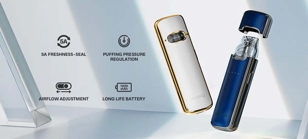 VMATE E’s streamlined curve is made possible with elegant metal. The body is polished in 14 processes over 150 minutes to form the smoothness and gloss. The leather offers the optimal touch feeling and luxury style. The LED indicator lights on and off with each puff, showing the real-time battery capacity. Features built-in 1200mAh battery and output power of up to 20W. The Vmate V2 cartridge holds up to 3ml Eliquid with the 0.7ohm or a 1.2ohm coil Pre -installation. that is an ideal starting point for those new to vaping. You can adjust the air to enjoy loose MTL to light MTL vaping.