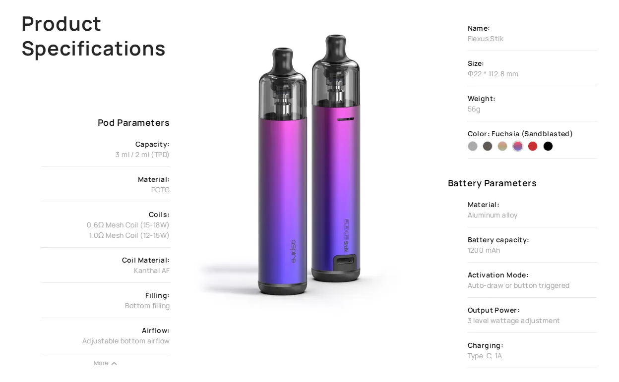 The Flexus Stik Vape kit is a portable and compact pen style vape kit constructed from durable zinc-alloy metal that features Aspire’s AST Chipset. featuring 3 power levels, integrated 1200mAh battery, the Flexus Stik Kit can deliver performance throughout the day and operates off a draw-activated method or can be fired from the recessed bottom button. Can hold up to 3ml using the Aspire AF Mesh Coil Series. providing a easy-to-carry pod system. Adopting a 3ml refillable pod, the Aspire Flexus Stik can hold both nicotine salts and freebase eJuice, and utilizes coils from the AF Mesh Coil Series, spanning both MTL or DTL vaping options.
