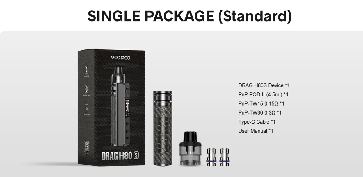 Drag H80S Kit consists of a Drag H80 Mod and a PNP Pod II. The mod is powered by GENE TT chip and one 18650 battery. Depending on the GENE TT chip, Drag H80 S is tailored to different vaping demands, equipped with SMART, RBA, and ECO Mode, giving you a long-lasting and good amount of vaping time if you set ECO mode. What’s more, Drag H80 S Kit features software upgrading function, you can upgrade the software to the latest version on VOOPOO official website. The PNP Pod II has 4.5ml e-juice capacity and is compatible with all PNP coils.
