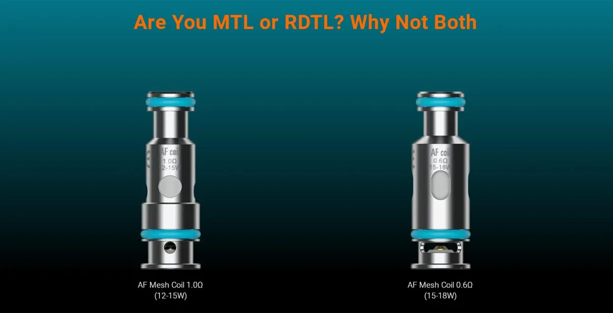 コイルタイプ: AFメッシュ0.6ohmコイル(15-18W, RDTL)/1.0ohmコイル(12-15W MTL)