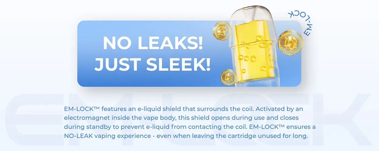 Uwell Dillonは、実用性を基盤とした未来を形作る変革力を持っています。偉大なビジョンを持ち、素晴らしいビジョンを実現することができます。この製品は、漏れを終わらせ、洗練されたベイプ体験を創造する革新的なアンチリークソリューションであるEM-LOCKを採用しています。EM-LOCKテクノロジーには、カートリッジ内のコイルを取り囲むe-リキッドシールドが組み込まれており、ベイプ本体内部の電磁石によって作動します。このシールドは使用中に開いて最適なベイピングを可能にし、スタンバイ時に閉じてカートリッジ内のe-リキッドがコイルに接触するのを防止します。したがって、ユーザーはこれから面倒な漏れにさよならできます!