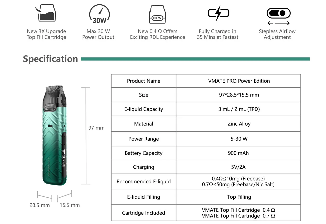 Voopoo VMATE PRO Power Editionは、VMATE PROのアップグレード版キットです。新しいVMATE Top Fill Cartridge 3倍のアップグレード、最大30Wの出力を持つ内蔵900mAhバッテリー、2Aの高速充電で、純粋な味わいの旅を強化します。VMATE Top Fill Cartridge 0.4ohmと組み合わせて、RDL体験を楽しむことができます(0.4ohmポッドはVMATE PRO Power EditionとVMATE MAXのみと互換性があります)。