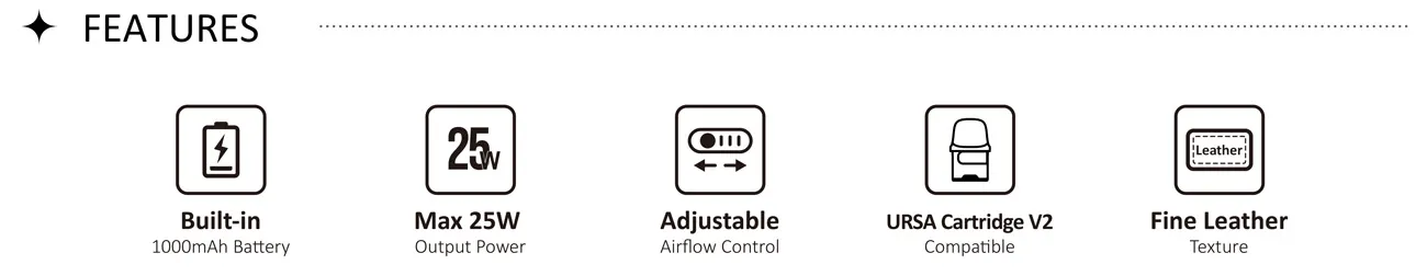Lost Vape Ursa Nano S II ポッドキットは、統合された1000mAhのバッテリーを搭載しており、2.5mlのベイプジュースを保持できます。最高出力は25Wに達し、Ursa V2 ポッドカートリッジ(0.6ohmおよび0.8ohm)と完全に互換性があります。フリーベースニコチンジュースとニコチンソルトを含む電子ジュースに対応しています。抗漏れ設計のトップフィリングポッドにより、より便利で簡単に vaping を楽しむことができます。精密なエアフローコントロールにより、MTL(マウストゥ肺)やRDL(リストリクテッド ダイレクト ラング)を自由に楽しむことができます。